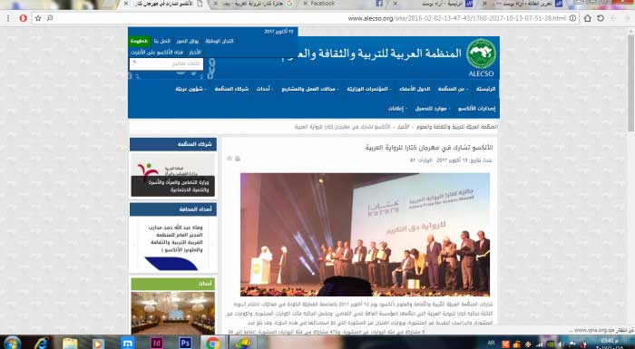 شاركت المنظّمة العربيّة للتّربية والثّقافة والعلوم (ألكسو) يوم 12 أكتوبر 2017 بالعاصمة القطريّة الدّوحة في فعاليّات اختتام الدورة الثالثة لجائزة كتارا للرواية العربية التي تنظّمها المؤسسة العامّة للحي الثقافي. وتشمل الجائزة فئات الرّوايات المنشورة، والرّوايات غير المنشورة، والدراسات النقدية غير المنشورة، وروايات الفتيان غير المنشورة التي تمّ استحداثها في هذه الدورة. وقد بلغ عدد المشارَكات 1144 مشارَكة، منها 550 مشارَكة في فئة الروايات غير المنشورة، و472 مشارَكة في فئة الروايات المنشورة، إضافة إلى 38 دراسة غير منشورة، و84 مشاركة في فئة روايات الفتيان غير المنشورة.