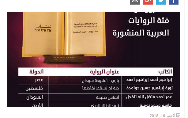 وتم خلال الحفل الإعلان عن الفائزين عن فئة الروايات العربية المنشورة وفاز بها كل من: المصري إبراهيم أحمد إبراهيم أحمد عن رواية ” باري – أنشودة شودان”، ومن فلسطين الكاتبة ثورة إبراهيم حسين حوامدة عن رواية ” جنة لم تسقط تفاحتها”، ومن السودان عمر أحمد فاضل الله الفحل عن رواية ” أنفاس صليحة”، ومن الأردن قاسم محمد توفيق عن رواية ” نزف الطائر الصغير”، ومن سوريا نجاة حسين عبد الصمد عن رواية ” لا ماء يرويها”.